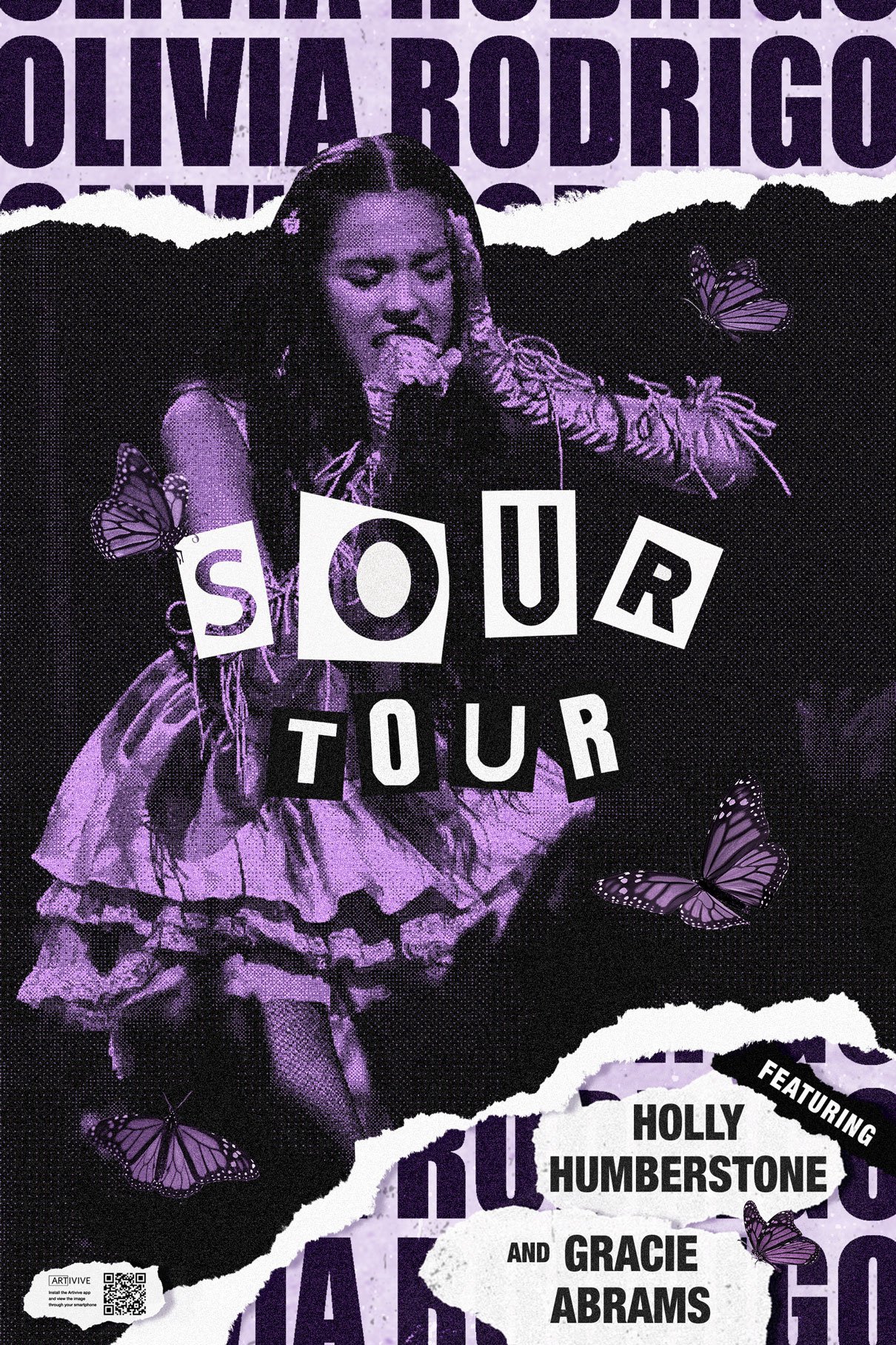 After releasing her debut album in May 2021, Olivia Rodrigo has found herself as one of the most successful female artists in the music industry today. This project set out to promote her first world tour “SOUR”. The poster calls on elements from Rodrigo’s first albums’ [SOUR] brand identity and takes inspiration from 90s and Y2K music posters. Scan the QR code using the app “Artivive” and watch the poster come to life. The animation is a continuation of the retro style using video elements from Olivia Rodrigo, Holly Humberston, and Gracie Abrams’ live performances.